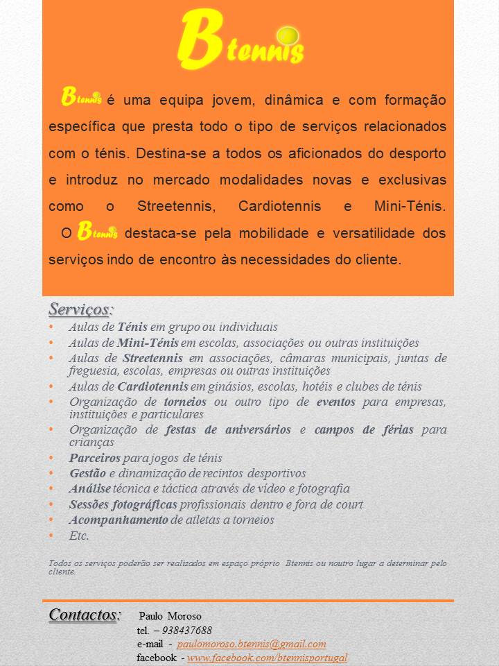 O Btennis quer com isto levar a modalidade Ténis à população e daí prestar outro tipo de serviços, tais como: